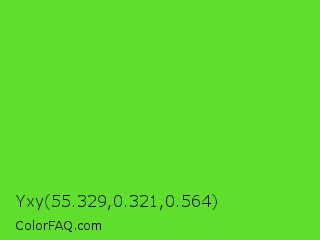 Yxy 55.329,0.321,0.564 Color is a normal green color and the nearest color is Harlequin Green #46cb18. Hex code #5fdf2b and RGB value is rgb(95,223,43). In RGB color space, this color is composed of 37% red, 87% green, 17% blue, In CMYK color space, this color is composed of 57% cyan, 0% magenta, 81% yellow , 13% black , In HSL color space, this color has a hue angle of 103° , 74% saturation and 52% lightness.