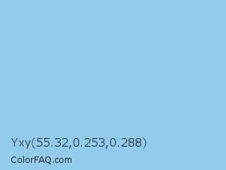 Yxy 55.32,0.253,0.288 Color is a light blue color and the nearest color is Cornflower #93ccea. Hex code #91cced and RGB value is rgb(145,204,237). In RGB color space, this color is composed of 57% red, 80% green, 93% blue, In CMYK color space, this color is composed of 39% cyan, 14% magenta, 0% yellow , 7% black , In HSL color space, this color has a hue angle of 202° , 72% saturation and 75% lightness.