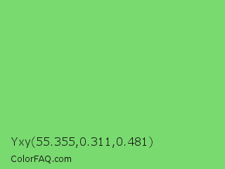 Yxy 55.355,0.311,0.481 Color is a light green color and the nearest color is Pastel Green #77dd77. Hex code #79da6f and RGB value is rgb(121,218,111). In RGB color space, this color is composed of 47% red, 85% green, 44% blue, In CMYK color space, this color is composed of 44% cyan, 0% magenta, 49% yellow , 15% black , In HSL color space, this color has a hue angle of 114° , 59% saturation and 65% lightness.