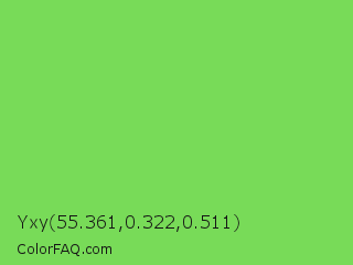 Yxy 55.361,0.322,0.511 Color is a normal green color and the nearest color is Mantis #74c365. Hex code #78db58 and RGB value is rgb(120,219,88). In RGB color space, this color is composed of 47% red, 86% green, 35% blue, In CMYK color space, this color is composed of 45% cyan, 0% magenta, 60% yellow , 14% black , In HSL color space, this color has a hue angle of 105° , 65% saturation and 60% lightness.