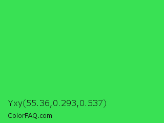 Yxy 55.36,0.293,0.537 Color is a normal green color and the nearest color is UFO Green #3cd070. Hex code #39e154 and RGB value is rgb(57,225,84). In RGB color space, this color is composed of 22% red, 88% green, 33% blue, In CMYK color space, this color is composed of 75% cyan, 0% magenta, 63% yellow , 12% black , In HSL color space, this color has a hue angle of 130° , 74% saturation and 55% lightness.