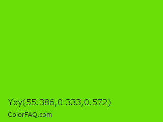 Yxy 55.386,0.333,0.572 Color is a normal green color and the nearest color is Alien Armpit #84de02. Hex code #6bde07 and RGB value is rgb(107,222,7). In RGB color space, this color is composed of 42% red, 87% green, 3% blue, In CMYK color space, this color is composed of 52% cyan, 0% magenta, 97% yellow , 13% black , In HSL color space, this color has a hue angle of 92° , 94% saturation and 45% lightness.