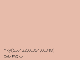 Yxy 55.432,0.364,0.348 Color is a light orange color and the nearest color is Cashmere #e6bea5. Hex code #e7bbaa and RGB value is rgb(231,187,170). In RGB color space, this color is composed of 91% red, 73% green, 67% blue, In CMYK color space, this color is composed of 0% cyan, 19% magenta, 26% yellow , 9% black , In HSL color space, this color has a hue angle of 17° , 56% saturation and 79% lightness.