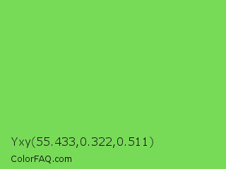 Yxy 55.433,0.322,0.511 Color is a normal green color and the nearest color is Mantis #74c365. Hex code #78db58 and RGB value is rgb(120,219,88). In RGB color space, this color is composed of 47% red, 86% green, 35% blue, In CMYK color space, this color is composed of 45% cyan, 0% magenta, 60% yellow , 14% black , In HSL color space, this color has a hue angle of 105° , 65% saturation and 60% lightness.