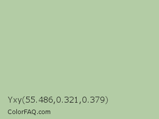 Yxy 55.486,0.321,0.379 Color is a light green color and the nearest color is Rainee #b9c8ac. Hex code #b3cca5 and RGB value is rgb(179,204,165). In RGB color space, this color is composed of 70% red, 80% green, 65% blue, In CMYK color space, this color is composed of 12% cyan, 0% magenta, 19% yellow , 20% black , In HSL color space, this color has a hue angle of 98° , 28% saturation and 72% lightness.
