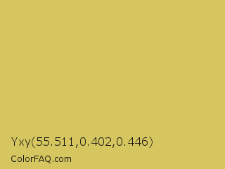 Yxy 55.511,0.402,0.446 Color is a light yellow color and the nearest color is Tacha #d6c562. Hex code #d6c65f and RGB value is rgb(214,198,95). In RGB color space, this color is composed of 84% red, 78% green, 37% blue, In CMYK color space, this color is composed of 0% cyan, 7% magenta, 56% yellow , 16% black , In HSL color space, this color has a hue angle of 52° , 59% saturation and 61% lightness.