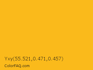 Yxy 55.521,0.471,0.457 Color is a normal orange color and the nearest color is Lightning Yellow #fcc01e. Hex code #faba1b and RGB value is rgb(250,186,27). In RGB color space, this color is composed of 98% red, 73% green, 11% blue, In CMYK color space, this color is composed of 0% cyan, 26% magenta, 89% yellow , 2% black , In HSL color space, this color has a hue angle of 43° , 96% saturation and 54% lightness.