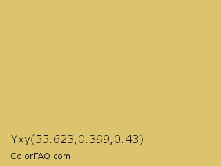 Yxy 55.623,0.399,0.43 Color is a light yellow color and the nearest color is Apache #dfbe6f. Hex code #dbc46c and RGB value is rgb(219,196,108). In RGB color space, this color is composed of 86% red, 77% green, 42% blue, In CMYK color space, this color is composed of 0% cyan, 11% magenta, 51% yellow , 14% black , In HSL color space, this color has a hue angle of 48° , 61% saturation and 64% lightness.