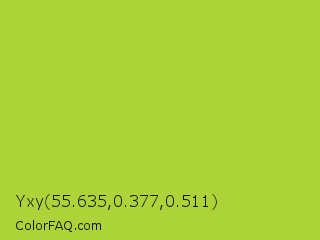 Yxy 55.635,0.377,0.511 Color is a normal lime color and the nearest color is Android Green #a4c639. Hex code #acd337 and RGB value is rgb(172,211,55). In RGB color space, this color is composed of 67% red, 83% green, 22% blue, In CMYK color space, this color is composed of 18% cyan, 0% magenta, 74% yellow , 17% black , In HSL color space, this color has a hue angle of 75° , 64% saturation and 52% lightness.