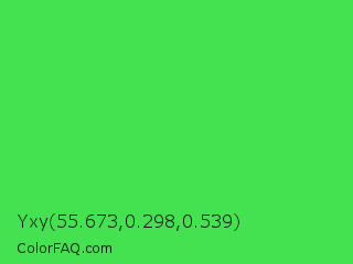 Yxy 55.673,0.298,0.539 Color is a normal green color and the nearest color is UFO Green #3cd070. Hex code #44e151 and RGB value is rgb(68,225,81). In RGB color space, this color is composed of 27% red, 88% green, 32% blue, In CMYK color space, this color is composed of 70% cyan, 0% magenta, 64% yellow , 12% black , In HSL color space, this color has a hue angle of 125° , 72% saturation and 57% lightness.