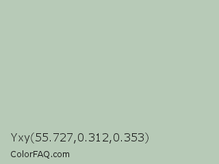 Yxy 55.727,0.312,0.353 Color is a light green color and the nearest color is Clay Ash #bdc8b3. Hex code #b7cab7 and RGB value is rgb(183,202,183). In RGB color space, this color is composed of 72% red, 79% green, 72% blue, In CMYK color space, this color is composed of 9% cyan, 0% magenta, 9% yellow , 21% black , In HSL color space, this color has a hue angle of 120° , 15% saturation and 75% lightness.