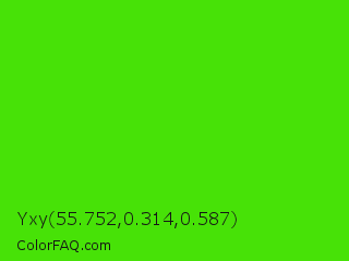 Yxy 55.752,0.314,0.587 Color is a normal green color and the nearest color is Harlequin Green #46cb18. Hex code #47e207 and RGB value is rgb(71,226,7). In RGB color space, this color is composed of 28% red, 89% green, 3% blue, In CMYK color space, this color is composed of 69% cyan, 0% magenta, 97% yellow , 11% black , In HSL color space, this color has a hue angle of 102° , 94% saturation and 46% lightness.