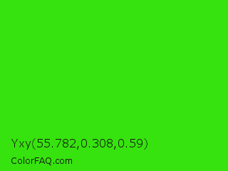 Yxy 55.782,0.308,0.59 Color is a normal green color and the nearest color is Neon Green #39ff14. Hex code #37e30e and RGB value is rgb(55,227,14). In RGB color space, this color is composed of 22% red, 89% green, 5% blue, In CMYK color space, this color is composed of 76% cyan, 0% magenta, 94% yellow , 11% black , In HSL color space, this color has a hue angle of 108° , 88% saturation and 47% lightness.
