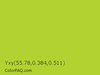 Yxy 55.78,0.384,0.511 Color is a normal lime color and the nearest color is Android Green #a4c639. Hex code #b2d231 and RGB value is rgb(178,210,49). In RGB color space, this color is composed of 70% red, 82% green, 19% blue, In CMYK color space, this color is composed of 15% cyan, 0% magenta, 77% yellow , 18% black , In HSL color space, this color has a hue angle of 72° , 64% saturation and 51% lightness.