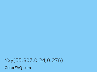 Yxy 55.807,0.24,0.276 Color is a light blue color and the nearest color is Light Sky Blue #87cefa. Hex code #83cef9 and RGB value is rgb(131,206,249). In RGB color space, this color is composed of 51% red, 81% green, 98% blue, In CMYK color space, this color is composed of 47% cyan, 17% magenta, 0% yellow , 2% black , In HSL color space, this color has a hue angle of 202° , 91% saturation and 75% lightness.