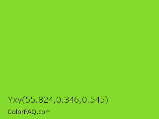 Yxy 55.824,0.346,0.545 Color is a normal green color and the nearest color is Atlantis #97cd2d. Hex code #85db2b and RGB value is rgb(133,219,43). In RGB color space, this color is composed of 52% red, 86% green, 17% blue, In CMYK color space, this color is composed of 39% cyan, 0% magenta, 80% yellow , 14% black , In HSL color space, this color has a hue angle of 89° , 71% saturation and 51% lightness.