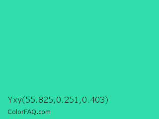 Yxy 55.825,0.251,0.403 Color is a normal green color and the nearest color is Eucalyptus #44d7a8. Hex code #30deac and RGB value is rgb(48,222,172). In RGB color space, this color is composed of 19% red, 87% green, 67% blue, In CMYK color space, this color is composed of 78% cyan, 0% magenta, 23% yellow , 13% black , In HSL color space, this color has a hue angle of 163° , 73% saturation and 53% lightness.