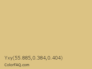 Yxy 55.885,0.384,0.404 Color is a light orange color and the nearest color is Burlywood #deb887. Hex code #dcc383 and RGB value is rgb(220,195,131). In RGB color space, this color is composed of 86% red, 76% green, 51% blue, In CMYK color space, this color is composed of 0% cyan, 11% magenta, 40% yellow , 14% black , In HSL color space, this color has a hue angle of 43° , 56% saturation and 69% lightness.