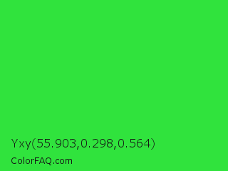 Yxy 55.903,0.298,0.564 Color is a normal green color and the nearest color is Lime Green #32cd32. Hex code #30e33d and RGB value is rgb(48,227,61). In RGB color space, this color is composed of 19% red, 89% green, 24% blue, In CMYK color space, this color is composed of 79% cyan, 0% magenta, 73% yellow , 11% black , In HSL color space, this color has a hue angle of 124° , 76% saturation and 54% lightness.