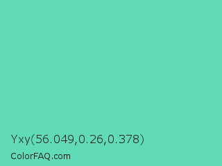 Yxy 56.049,0.26,0.378 Color is a light green color and the nearest color is Medium Aquamarine #66ddaa. Hex code #61dab7 and RGB value is rgb(97,218,183). In RGB color space, this color is composed of 38% red, 85% green, 72% blue, In CMYK color space, this color is composed of 56% cyan, 0% magenta, 16% yellow , 15% black , In HSL color space, this color has a hue angle of 163° , 62% saturation and 62% lightness.