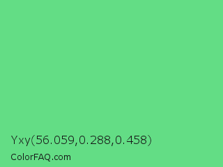 Yxy 56.059,0.288,0.458 Color is a light green color and the nearest color is Very Light Malachite Green #64e986. Hex code #63dd85 and RGB value is rgb(99,221,133). In RGB color space, this color is composed of 39% red, 87% green, 52% blue, In CMYK color space, this color is composed of 55% cyan, 0% magenta, 40% yellow , 13% black , In HSL color space, this color has a hue angle of 137° , 64% saturation and 63% lightness.