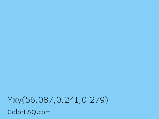 Yxy 56.087,0.241,0.279 Color is a light blue color and the nearest color is Light Sky Blue #87cefa. Hex code #83cff7 and RGB value is rgb(131,207,247). In RGB color space, this color is composed of 51% red, 81% green, 97% blue, In CMYK color space, this color is composed of 47% cyan, 16% magenta, 0% yellow , 3% black , In HSL color space, this color has a hue angle of 201° , 88% saturation and 74% lightness.