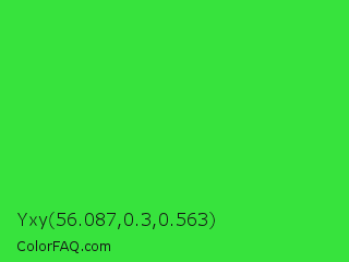 Yxy 56.087,0.3,0.563 Color is a normal green color and the nearest color is Lime Green #32cd32. Hex code #37e33d and RGB value is rgb(55,227,61). In RGB color space, this color is composed of 22% red, 89% green, 24% blue, In CMYK color space, this color is composed of 76% cyan, 0% magenta, 73% yellow , 11% black , In HSL color space, this color has a hue angle of 122° , 75% saturation and 55% lightness.