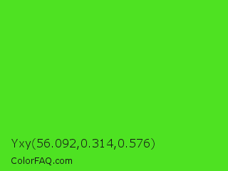 Yxy 56.092,0.314,0.576 Color is a normal green color and the nearest color is Harlequin Green #46cb18. Hex code #4ee222 and RGB value is rgb(78,226,34). In RGB color space, this color is composed of 31% red, 89% green, 13% blue, In CMYK color space, this color is composed of 65% cyan, 0% magenta, 85% yellow , 11% black , In HSL color space, this color has a hue angle of 106° , 77% saturation and 51% lightness.