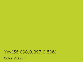 Yxy 56.098,0.397,0.506 Color is a normal yellow color and the nearest color is Key Lime Pie #bfc921. Hex code #bdd02b and RGB value is rgb(189,208,43). In RGB color space, this color is composed of 74% red, 82% green, 17% blue, In CMYK color space, this color is composed of 9% cyan, 0% magenta, 79% yellow , 18% black , In HSL color space, this color has a hue angle of 67° , 66% saturation and 49% lightness.