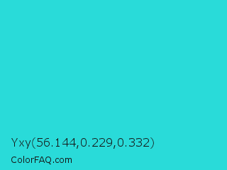 Yxy 56.144,0.229,0.332 Color is a normal cyan color and the nearest color is Turquoise PWG #30d5c8. Hex code #29dbd9 and RGB value is rgb(41,219,217). In RGB color space, this color is composed of 16% red, 86% green, 85% blue, In CMYK color space, this color is composed of 81% cyan, 0% magenta, 1% yellow , 14% black , In HSL color space, this color has a hue angle of 179° , 71% saturation and 51% lightness.