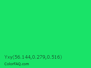 Yxy 56.144,0.279,0.516 Color is a normal green color and the nearest color is Malachite #0bda51. Hex code #19e368 and RGB value is rgb(25,227,104). In RGB color space, this color is composed of 10% red, 89% green, 41% blue, In CMYK color space, this color is composed of 89% cyan, 0% magenta, 54% yellow , 11% black , In HSL color space, this color has a hue angle of 143° , 80% saturation and 49% lightness.