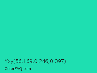 Yxy 56.169,0.246,0.397 Color is a normal cyan color and the nearest color is Turquoise PWG #30d5c8. Hex code #1edfb1 and RGB value is rgb(30,223,177). In RGB color space, this color is composed of 12% red, 87% green, 69% blue, In CMYK color space, this color is composed of 87% cyan, 0% magenta, 21% yellow , 13% black , In HSL color space, this color has a hue angle of 166° , 76% saturation and 50% lightness.