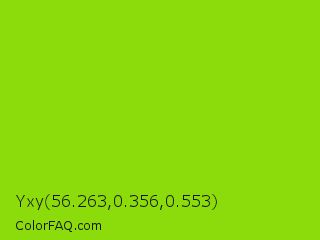 Yxy 56.263,0.356,0.553 Color is a normal green color and the nearest color is Alien Armpit #84de02. Hex code #8cdb0b and RGB value is rgb(140,219,11). In RGB color space, this color is composed of 55% red, 86% green, 4% blue, In CMYK color space, this color is composed of 36% cyan, 0% magenta, 95% yellow , 14% black , In HSL color space, this color has a hue angle of 83° , 90% saturation and 45% lightness.