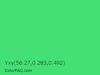 Yxy 56.27,0.283,0.492 Color is a normal green color and the nearest color is UFO Green #3cd070. Hex code #43e174 and RGB value is rgb(67,225,116). In RGB color space, this color is composed of 26% red, 88% green, 45% blue, In CMYK color space, this color is composed of 70% cyan, 0% magenta, 48% yellow , 12% black , In HSL color space, this color has a hue angle of 139° , 72% saturation and 57% lightness.