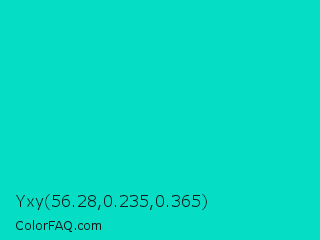 Yxy 56.28,0.235,0.365 Color is a normal cyan color and the nearest color is Robins Egg Blue #00cccc. Hex code #05dec5 and RGB value is rgb(5,222,197). In RGB color space, this color is composed of 2% red, 87% green, 77% blue, In CMYK color space, this color is composed of 98% cyan, 0% magenta, 11% yellow , 13% black , In HSL color space, this color has a hue angle of 173° , 96% saturation and 45% lightness.