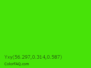 Yxy 56.297,0.314,0.587 Color is a normal green color and the nearest color is Harlequin Green #46cb18. Hex code #47e308 and RGB value is rgb(71,227,8). In RGB color space, this color is composed of 28% red, 89% green, 3% blue, In CMYK color space, this color is composed of 69% cyan, 0% magenta, 96% yellow , 11% black , In HSL color space, this color has a hue angle of 103° , 93% saturation and 46% lightness.