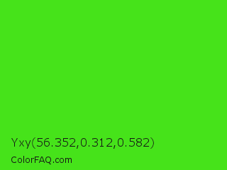 Yxy 56.352,0.312,0.582 Color is a normal green color and the nearest color is Harlequin Green #46cb18. Hex code #46e31a and RGB value is rgb(70,227,26). In RGB color space, this color is composed of 27% red, 89% green, 10% blue, In CMYK color space, this color is composed of 69% cyan, 0% magenta, 89% yellow , 11% black , In HSL color space, this color has a hue angle of 107° , 79% saturation and 50% lightness.