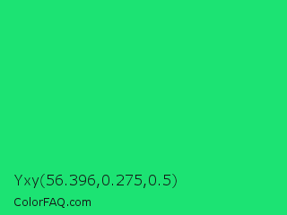 Yxy 56.396,0.275,0.5 Color is a normal green color and the nearest color is UFO Green #3cd070. Hex code #1ce373 and RGB value is rgb(28,227,115). In RGB color space, this color is composed of 11% red, 89% green, 45% blue, In CMYK color space, this color is composed of 88% cyan, 0% magenta, 49% yellow , 11% black , In HSL color space, this color has a hue angle of 146° , 78% saturation and 50% lightness.