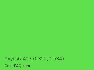 Yxy 56.403,0.312,0.534 Color is a normal green color and the nearest color is Screamin Green #66ff66. Hex code #61e04e and RGB value is rgb(97,224,78). In RGB color space, this color is composed of 38% red, 88% green, 31% blue, In CMYK color space, this color is composed of 57% cyan, 0% magenta, 65% yellow , 12% black , In HSL color space, this color has a hue angle of 112° , 70% saturation and 59% lightness.
