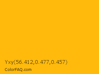 Yxy 56.412,0.477,0.457 Color is a normal orange color and the nearest color is Mikado Yellow #ffc40c. Hex code #ffba0c and RGB value is rgb(255,186,12). In RGB color space, this color is composed of 100% red, 73% green, 5% blue, In CMYK color space, this color is composed of 0% cyan, 27% magenta, 95% yellow , 0% black , In HSL color space, this color has a hue angle of 43° , 100% saturation and 52% lightness.
