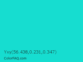 Yxy 56.438,0.231,0.347 Color is a normal cyan color and the nearest color is Bright Turquoise #08e8de. Hex code #16ddd0 and RGB value is rgb(22,221,208). In RGB color space, this color is composed of 9% red, 87% green, 82% blue, In CMYK color space, this color is composed of 90% cyan, 0% magenta, 6% yellow , 13% black , In HSL color space, this color has a hue angle of 176° , 82% saturation and 48% lightness.