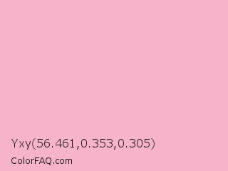 Yxy 56.461,0.353,0.305 Color is a very light rose color and the nearest color is Nadeshiko Pink #f6adc6. Hex code #f7b3ca and RGB value is rgb(247,179,202). In RGB color space, this color is composed of 97% red, 70% green, 79% blue, In CMYK color space, this color is composed of 0% cyan, 28% magenta, 18% yellow , 3% black , In HSL color space, this color has a hue angle of 340° , 81% saturation and 84% lightness.