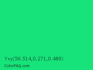 Yxy 56.514,0.271,0.489 Color is a normal green color and the nearest color is Spring Green #00ff7f. Hex code #16e37a and RGB value is rgb(22,227,122). In RGB color space, this color is composed of 9% red, 89% green, 48% blue, In CMYK color space, this color is composed of 90% cyan, 0% magenta, 46% yellow , 11% black , In HSL color space, this color has a hue angle of 149° , 82% saturation and 49% lightness.
