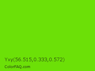 Yxy 56.515,0.333,0.572 Color is a normal green color and the nearest color is Alien Armpit #84de02. Hex code #6ce007 and RGB value is rgb(108,224,7). In RGB color space, this color is composed of 42% red, 88% green, 3% blue, In CMYK color space, this color is composed of 52% cyan, 0% magenta, 97% yellow , 12% black , In HSL color space, this color has a hue angle of 92° , 94% saturation and 45% lightness.