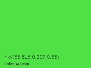 Yxy 56.516,0.307,0.55 Color is a normal green color and the nearest color is Lime Green #32cd32. Hex code #50e244 and RGB value is rgb(80,226,68). In RGB color space, this color is composed of 31% red, 89% green, 27% blue, In CMYK color space, this color is composed of 65% cyan, 0% magenta, 70% yellow , 11% black , In HSL color space, this color has a hue angle of 115° , 73% saturation and 58% lightness.