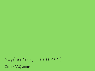 Yxy 56.533,0.33,0.491 Color is a light green color and the nearest color is Pistachio #93c572. Hex code #8bda63 and RGB value is rgb(139,218,99). In RGB color space, this color is composed of 55% red, 85% green, 39% blue, In CMYK color space, this color is composed of 36% cyan, 0% magenta, 55% yellow , 15% black , In HSL color space, this color has a hue angle of 100° , 62% saturation and 62% lightness.