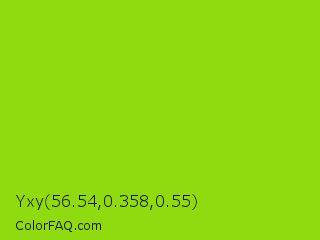 Yxy 56.54,0.358,0.55 Color is a normal green color and the nearest color is Sheen Green #8fd400. Hex code #8fdb10 and RGB value is rgb(143,219,16). In RGB color space, this color is composed of 56% red, 86% green, 6% blue, In CMYK color space, this color is composed of 35% cyan, 0% magenta, 93% yellow , 14% black , In HSL color space, this color has a hue angle of 82° , 86% saturation and 46% lightness.