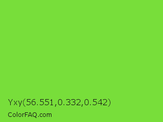 Yxy 56.551,0.332,0.542 Color is a normal green color and the nearest color is Kiwi #8ee53f. Hex code #78de3a and RGB value is rgb(120,222,58). In RGB color space, this color is composed of 47% red, 87% green, 23% blue, In CMYK color space, this color is composed of 46% cyan, 0% magenta, 74% yellow , 13% black , In HSL color space, this color has a hue angle of 97° , 71% saturation and 55% lightness.