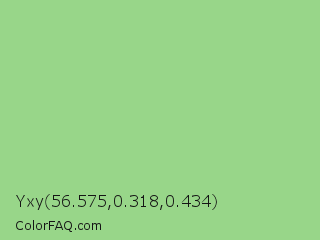Yxy 56.575,0.318,0.434 Color is a light green color and the nearest color is Feijoa #9fdd8c. Hex code #98d689 and RGB value is rgb(152,214,137). In RGB color space, this color is composed of 60% red, 84% green, 54% blue, In CMYK color space, this color is composed of 29% cyan, 0% magenta, 36% yellow , 16% black , In HSL color space, this color has a hue angle of 108° , 48% saturation and 69% lightness.