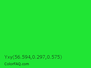 Yxy 56.594,0.297,0.575 Color is a normal green color and the nearest color is Lime Green #32cd32. Hex code #20e534 and RGB value is rgb(32,229,52). In RGB color space, this color is composed of 13% red, 90% green, 20% blue, In CMYK color space, this color is composed of 86% cyan, 0% magenta, 77% yellow , 10% black , In HSL color space, this color has a hue angle of 126° , 79% saturation and 51% lightness.